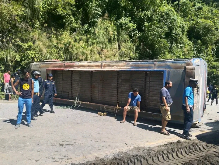 चितवनमा गुडिरहेको बसमाथि ढुंगा खस्दा अनियन्त्रित भएर पल्टियो, २५ जना घाइते