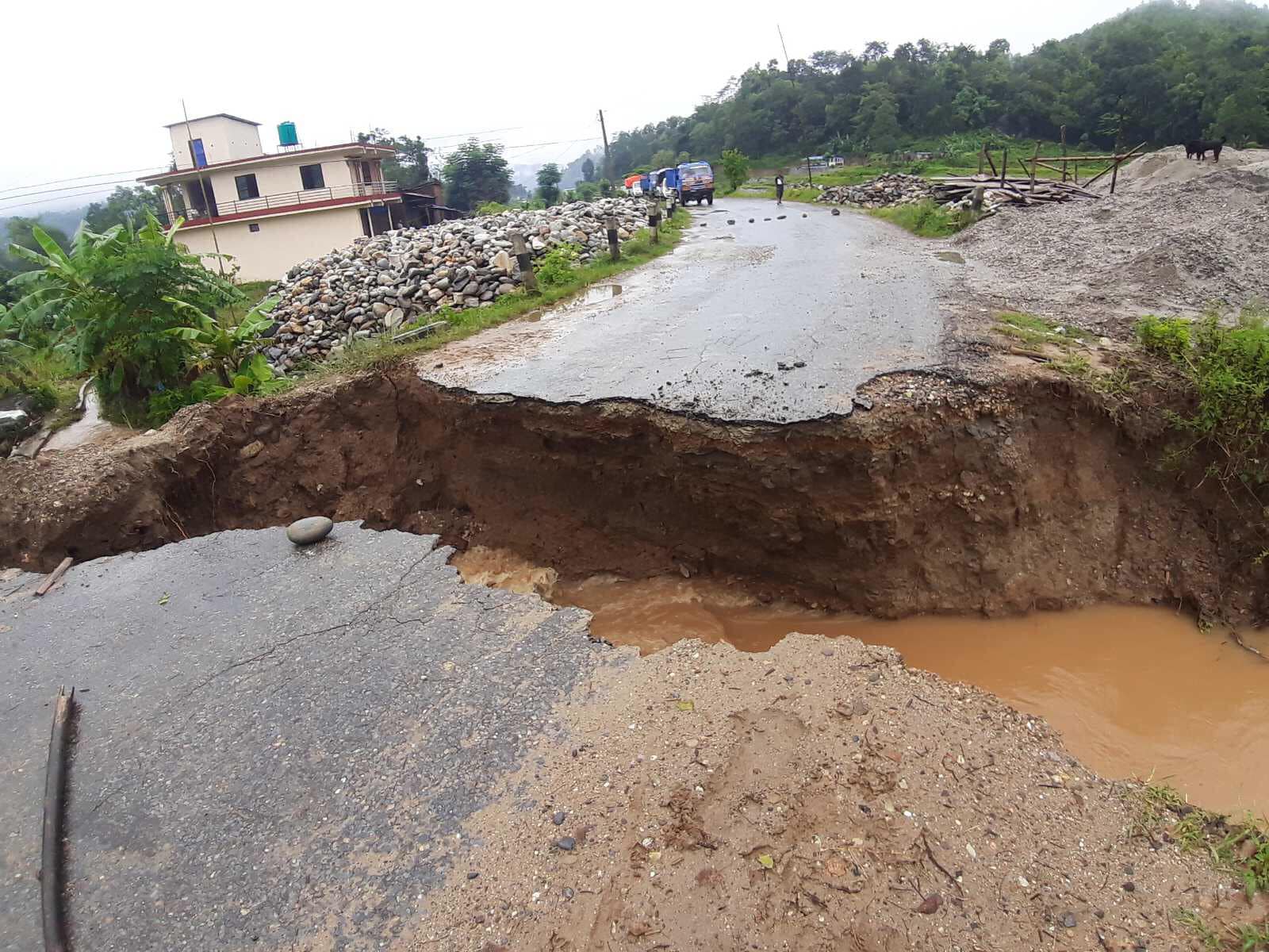 वर्षाका कारण सडक भासिँदा डुम्रे–वेशीशहर सडकखण्ड अवरुद्ध