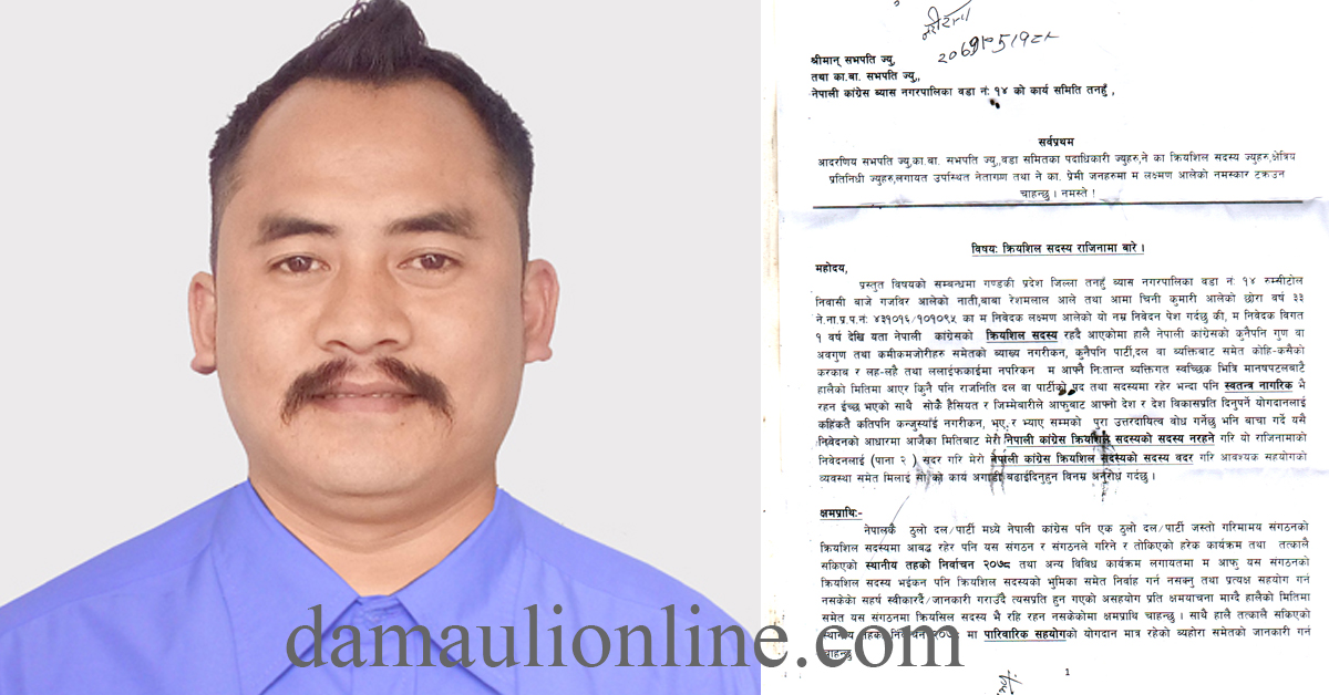 व्यास १४ निवासी लक्ष्मण आलेद्वारा कांग्रेसको क्रियशील सदस्यता परित्याग