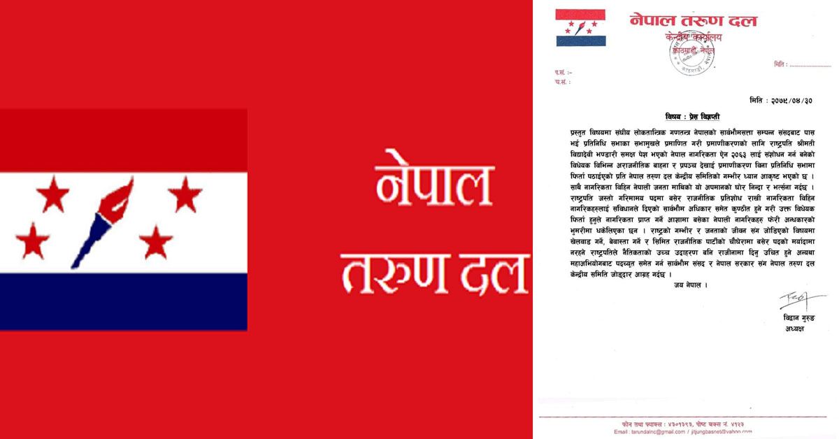 नागरिकता विधेयक फिर्ता पठाएपछि तरूण दलले माग्यो राष्ट्रपतिको राजीनामा