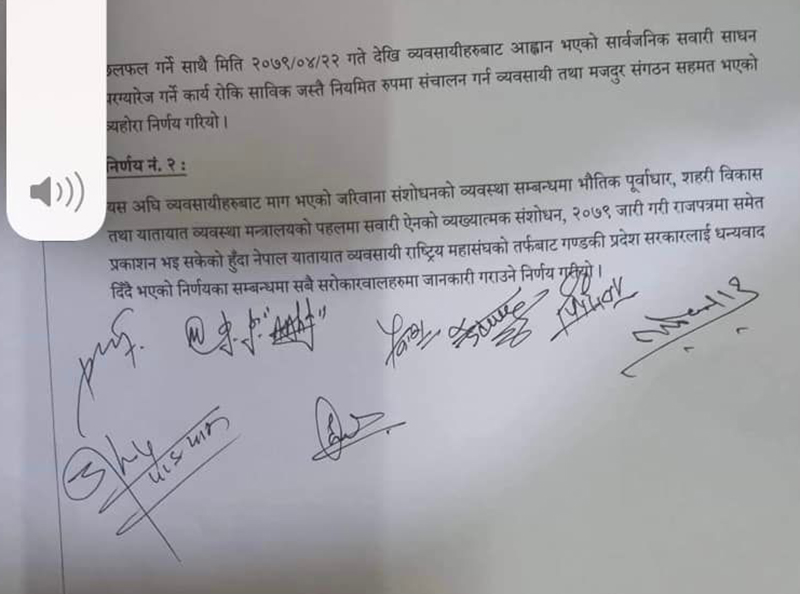 पोखरा : यातायात व्यवसायीहरुले आज आइतबारदेखि सवारी बन्द गर्ने निर्णय फिर्ता लिएका छन्।यातायात व्यवसायी र गण्डकी प्रदेश सरकारबीच दुई बुँदे सहमति भएसँगै आन्दोलन फिर्ता भएको हो।
