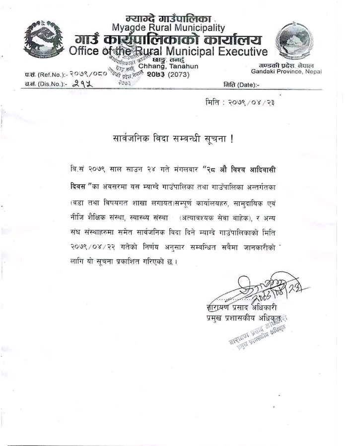 भोलि सार्वजनिक बिदा दिने म्याग्देको निर्णय
