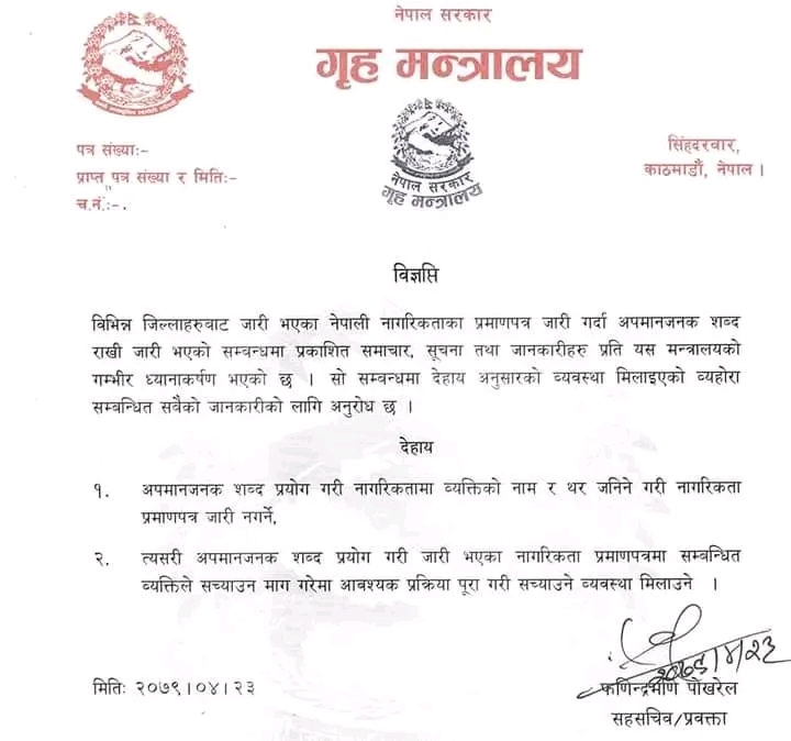 गृह मन्त्रालयले नागरिकतामा व्यक्तिको अपमानजनक नाम र थर उल्लेख हुने गरी नागरिकता प्रमाणपत्र जारी नगर्ने भएको छ।