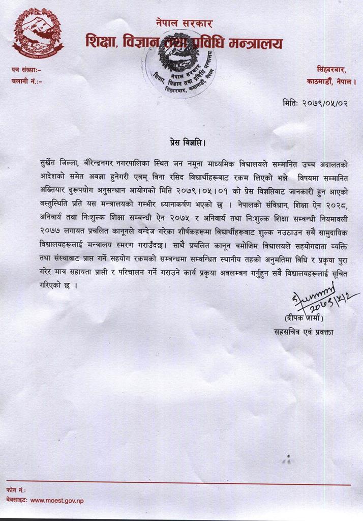 काठमाडौं : शिक्षा, विज्ञान तथा प्रविधि मन्त्रालयले निशुल्क शिक्षासम्बन्धी ऐनविपरीत कुनै पनि शीर्षकमा विद्यार्थीबाट शुल्क नउठाउन सामुदायिक विद्यालयहरूलाई निर्देशन दिएको छ ।