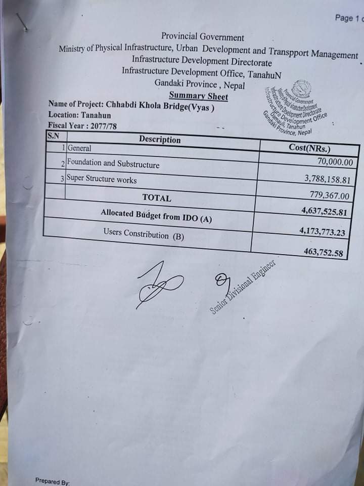 पुलको कुल लागत छयालीस लाख सैतिस हजार पाँच सय पच्चीस रुपैया एकसी पैसामा निर्माण हुने उक्त पुल निर्माण कार्य समितिको समेत लागत रहने छ l