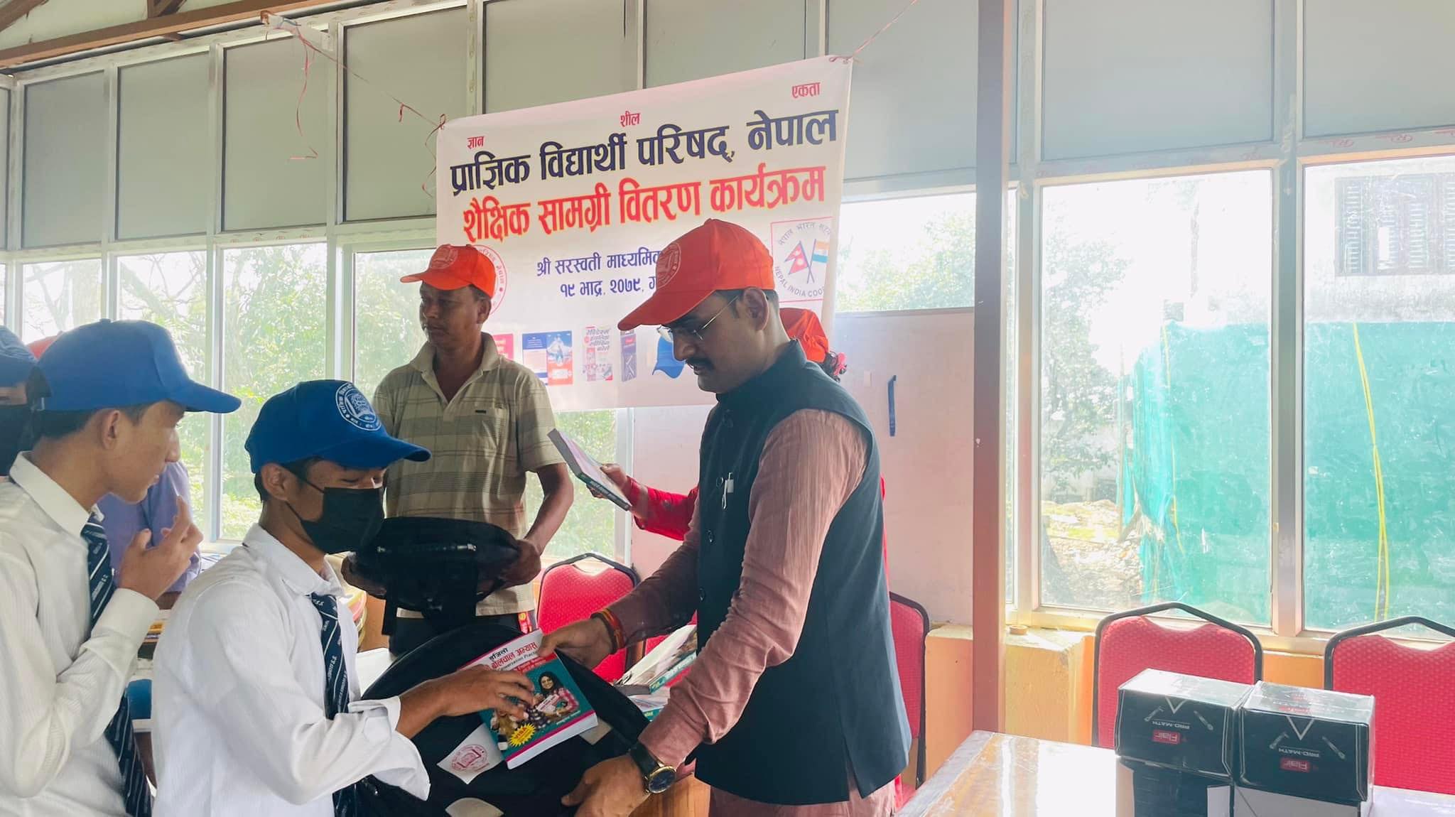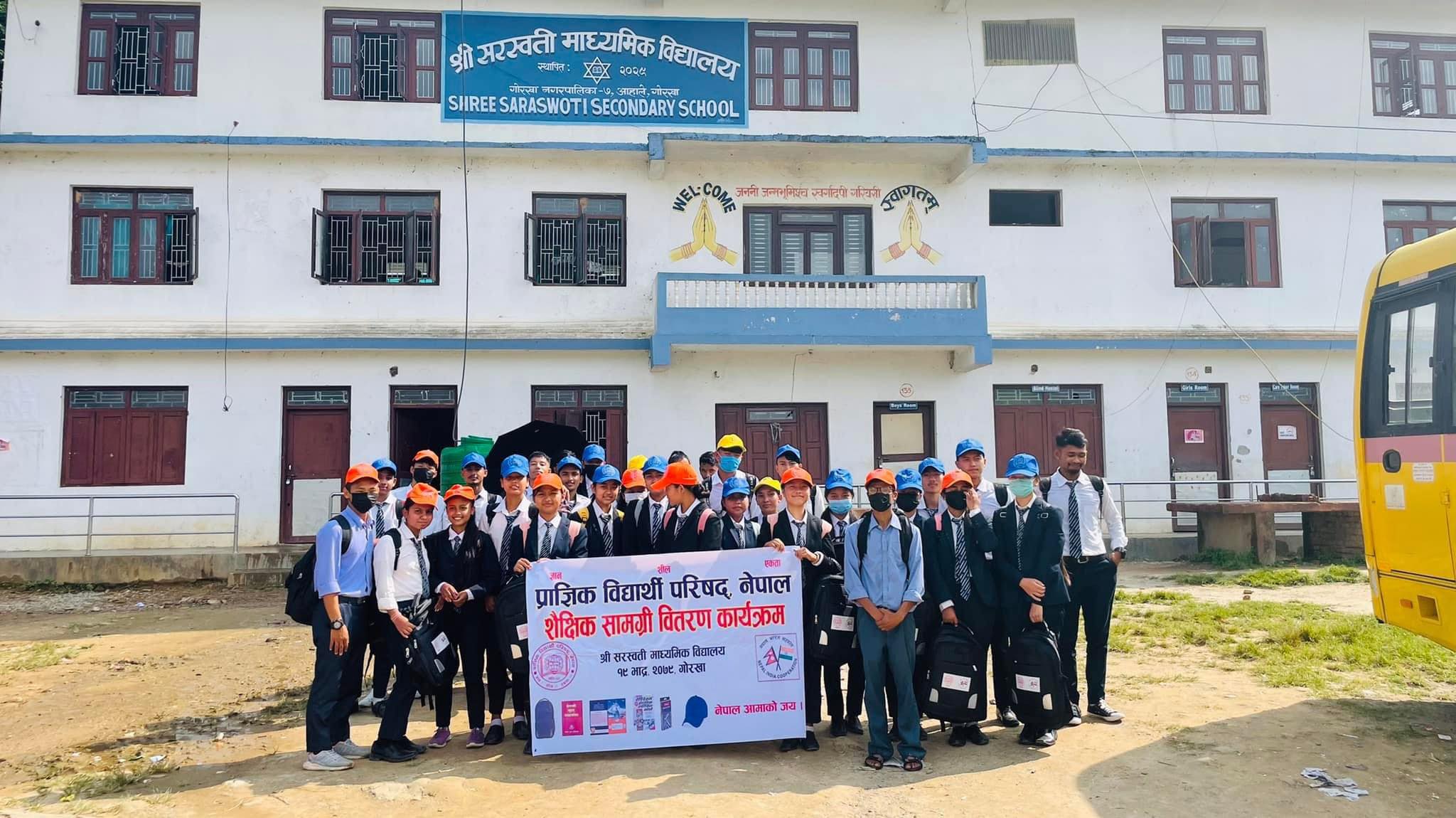 गाेरखा : प्राज्ञिक विद्यार्थी परिषद् नेपालले गाेरखा आहालेस्थित सरस्वती मा. वि मा शैक्षिक सामाग्री वितरण गरेकाे छ । आइतवार विद्यालयको प्राङ्गणमा एक समारोहको आयोजना गरि परिषदको सेवा कार्य अन्तर्गत त्यस क्षेत्रका विद्यालय सरस्वती मा.विमा अध्ययनरत ११२ जना विद्यार्थीहरूलाई शैक्षिक सामग्री वितरण गरिएको हो ।कार्यक्रममा विद्यार्थी परिषद्का राष्ट्रिय सह संगठन सचिव रमेश कण्डेलले विगत २७ बर्षदेखि निरन्तर सेवा कार्यहरू गर्दै आइरहेकाे र यसलाई निरन्तरता दिने क्रममा परिषद्ले ११ वटा हिमाली जिल्लाका विद्यार्थीलाई भारतीय जनता र भारत सकारबाट प्राप्त भएको शैक्षिक सामाग्री विद्यार्थीहरूलाई वितरण गरिएको र वितरण गरिएको सामग्रीमा प्रति विद्यार्थी व्याग, ५ वटा कपी, रेपिडेक्स पुस्तक, जमेक्ट्री बक्स, नेपाली बृहत् शब्दकोश, टोपी लगायत रहेको उल्लेख गर्दै सामग्री उपलब्ध गराउने भारतीय जनता र भारत सरकार एवम् वितरणको समन्वय गर्ने धन्यवाद दिए ।