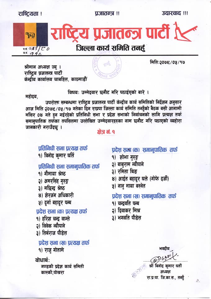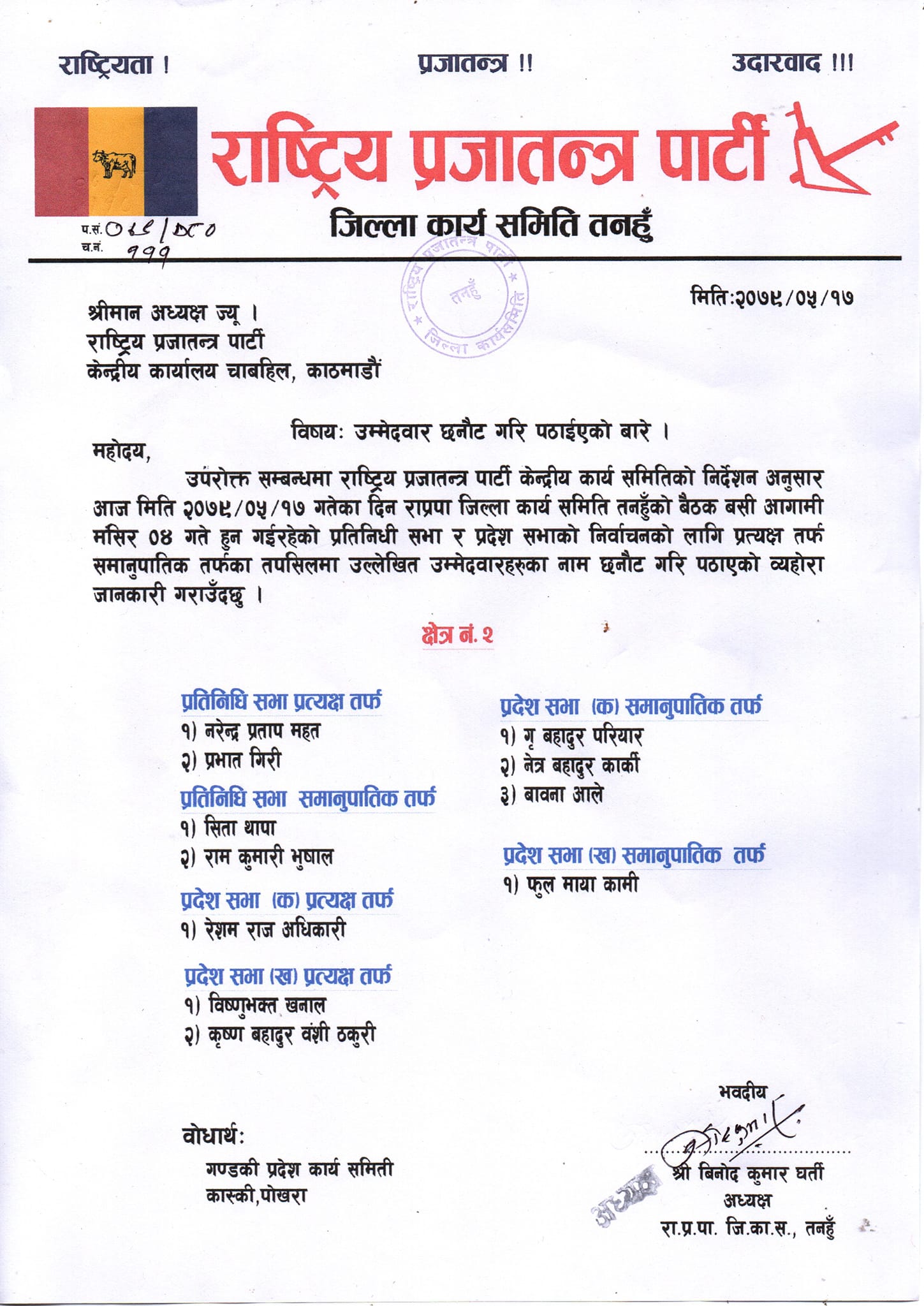 दमौली : राष्ट्रिय प्रजातन्त्र पार्टी (राप्रपा) तनहुँले  प्रतिनिधि सभा सदस्य उम्मेदवारका लागि जिल्ला अध्यक्ष विनोद घर्ति सहित ३ जना नेताहरूको नाम सिफारिस गरेको छ ।