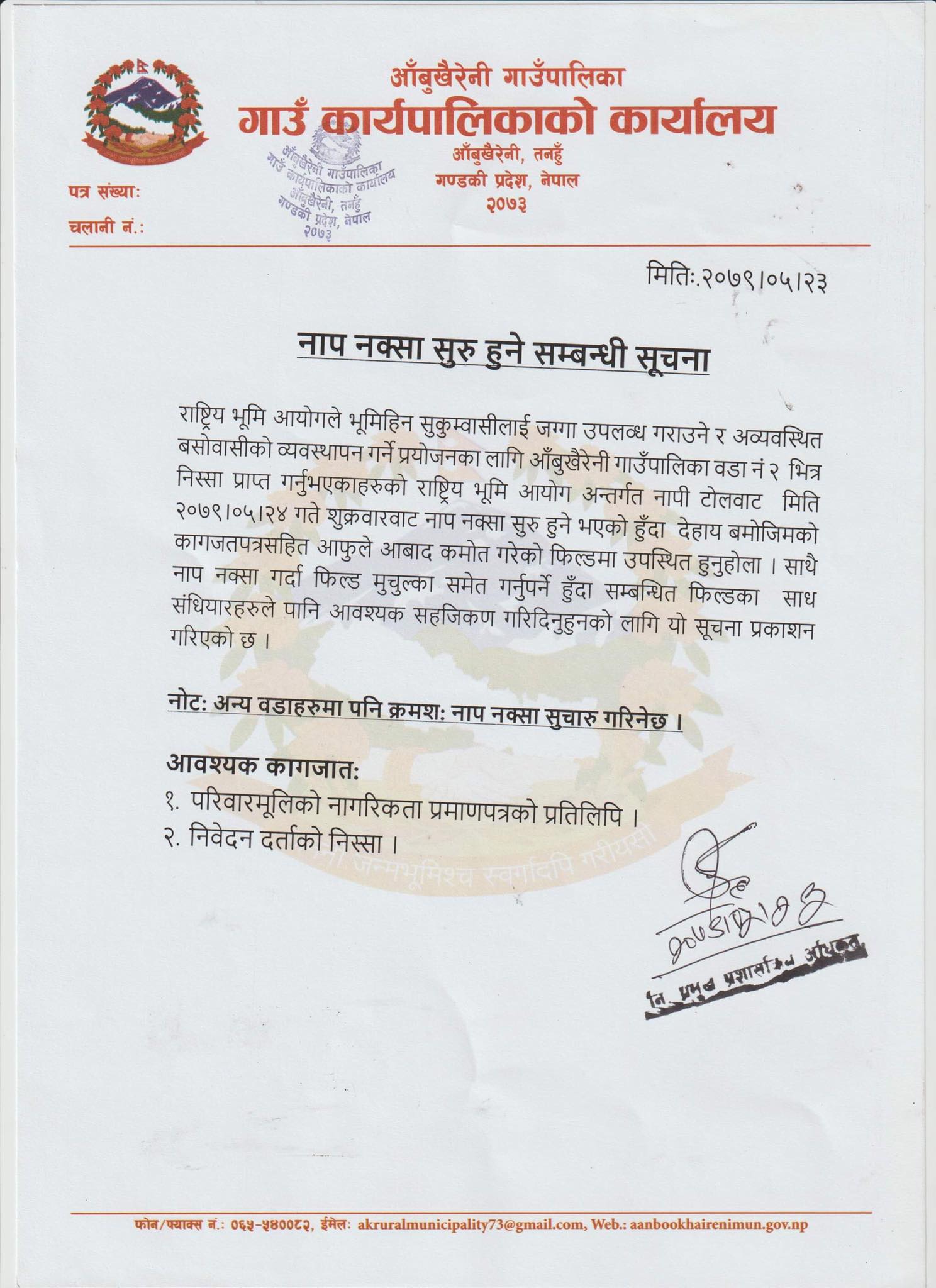 बिहिवार एक सूचना गर्दै भोलि शुक्रबार देखि स्थलगत नापनक्साको काम सुरु जनाएको हो ।गाउँपालिकाका अनुसार  प्राविधिक कर्मचारीहरु नापनक्साका लागि स्थलगत रुपमै खटाईने जनाएको छ ।