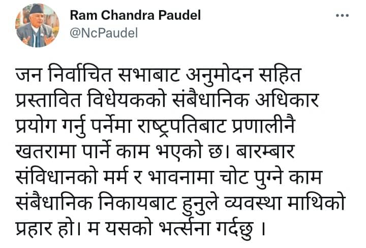 पौडेलले ट्वीट गर्दै संसदबाट अनुमोदन भएको विधेयक प्रमाणीकरण गरी संवैधानिक अधिकार प्रयोग गर्नुको साटो राष्ट्रपतिबाट विद्यमान राजनीतिक प्रणालीलाई नै खतरामा पार्ने काम भएको बताए।