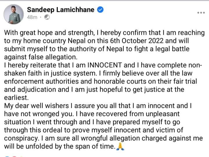 सामाजिक सञ्जाल फेसबुकमार्फत लामिछानेले अक्टोबर ६ अर्थात यही असोज २० गते नेपाल फर्किने बताएका छन् ।