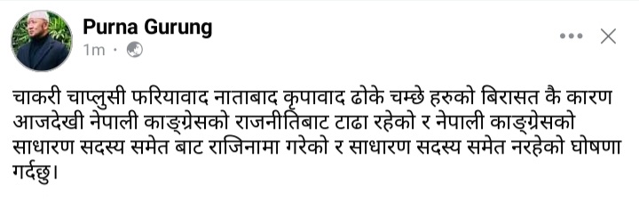 सोमबार गुरुङले आफ्नो सामाजिक सञ्जालमा लेख्दै आफूले पार्टीको साधारण सदस्यबाट राजीनामा दिएको बताएका हुन ।