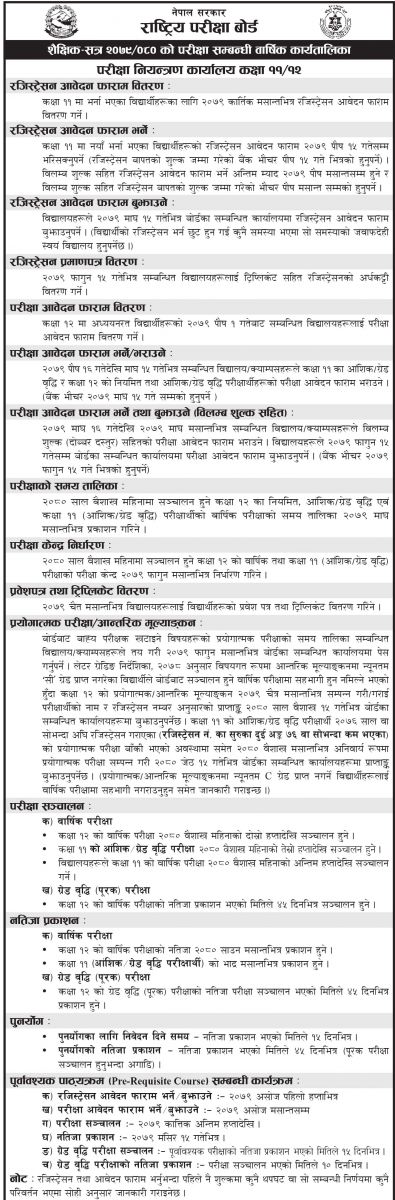 कार्यतालिका अनुसार कक्षा ११ मा भर्ना भएका विद्यार्थीलाई ०७९ कात्तिक मसान्तसम्म रजिस्ट्रेसस्ट्रेन आवेदन फाराम वितरण गरि सक्नुपर्नेछ। आवेदन फाराम भर्ने समय भने ०७९ पुस १५ गतेसम्म दिइएको छ।