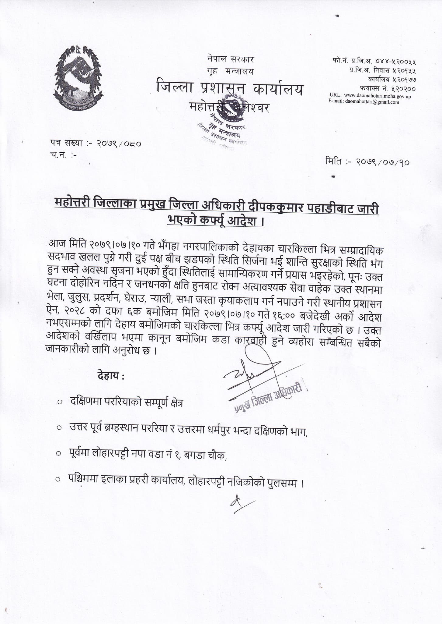 शान्त भएको विवाद राती बढ्न सक्ने आशंकामा त्यस क्षेत्रमा साँझ ४ बजेदेखि अनिश्चितकालीन कर्फ्यू जारी गरिएको जिल्ला प्रशासन कार्यालय महोत्तरीले जनाएको छ।