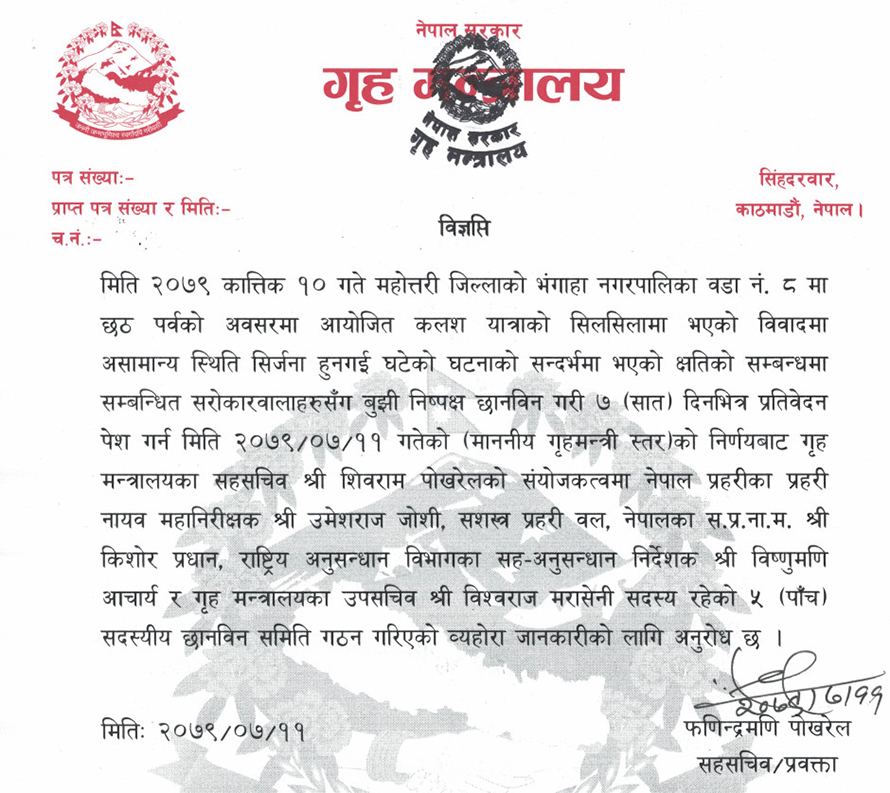 काठमाडौं : गृह मन्त्रालयले महोत्तरीको भंगाह नगरपालिकामा भएको घटनाबारे छानबिन गर्न समिति गठन गरेको छ। शुक्रबार मन्त्रालयका सहसचिव शिवराम पोखरेलको संयोजकत्वमा पाँच सदस्यीय समिति गठन गरिएको हो ।