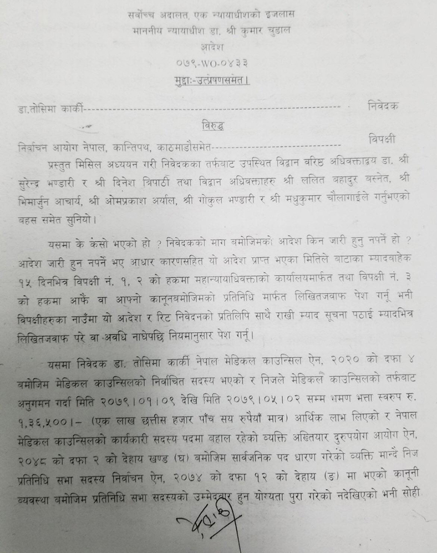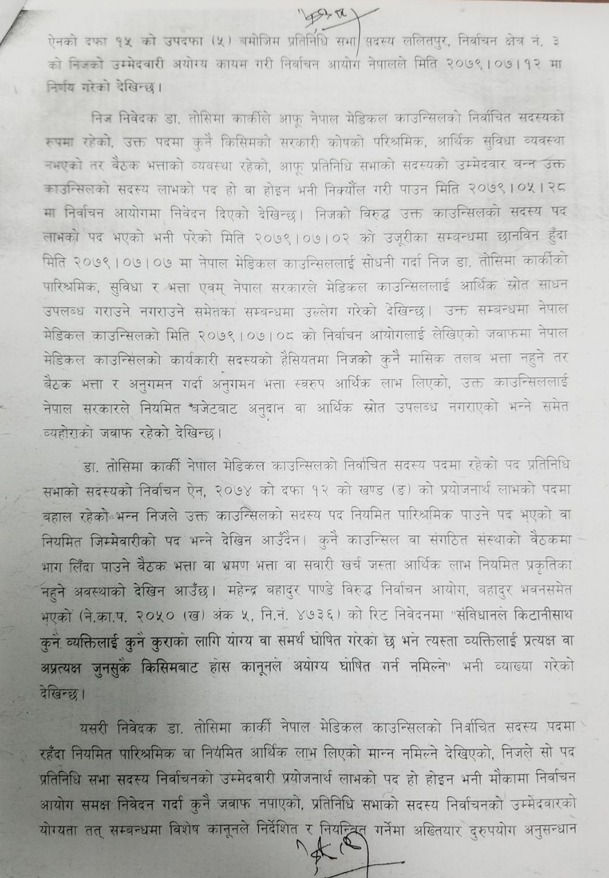 कार्की नेपाल मेडिकल काउन्सिलको निर्वाचित सदस्य रहेको र उक्त पद लाभको पद भएको भन्दै निर्वाचन आयोगले कात्तिक १२ गते उनको उम्मेदवारी खारेज गर्ने निर्णय गरेपछि कार्कीले सोमबार सर्वोच्च अदालतमा रिट दायर गरेको थियाे ।