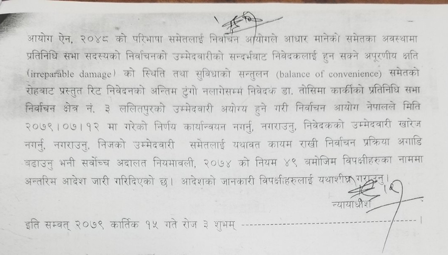काठमाडाैँ : सर्वोच्च अदालतले ललितपुर–३ मा राष्ट्रिय स्वतन्त्र पार्टीका उम्मेदवार डा. तोसिमा कार्कीको उम्मेदवारी खारेज नगर्न निर्वाचन आयोगका नाममा अन्तरिम आदेश दिएको छ ।