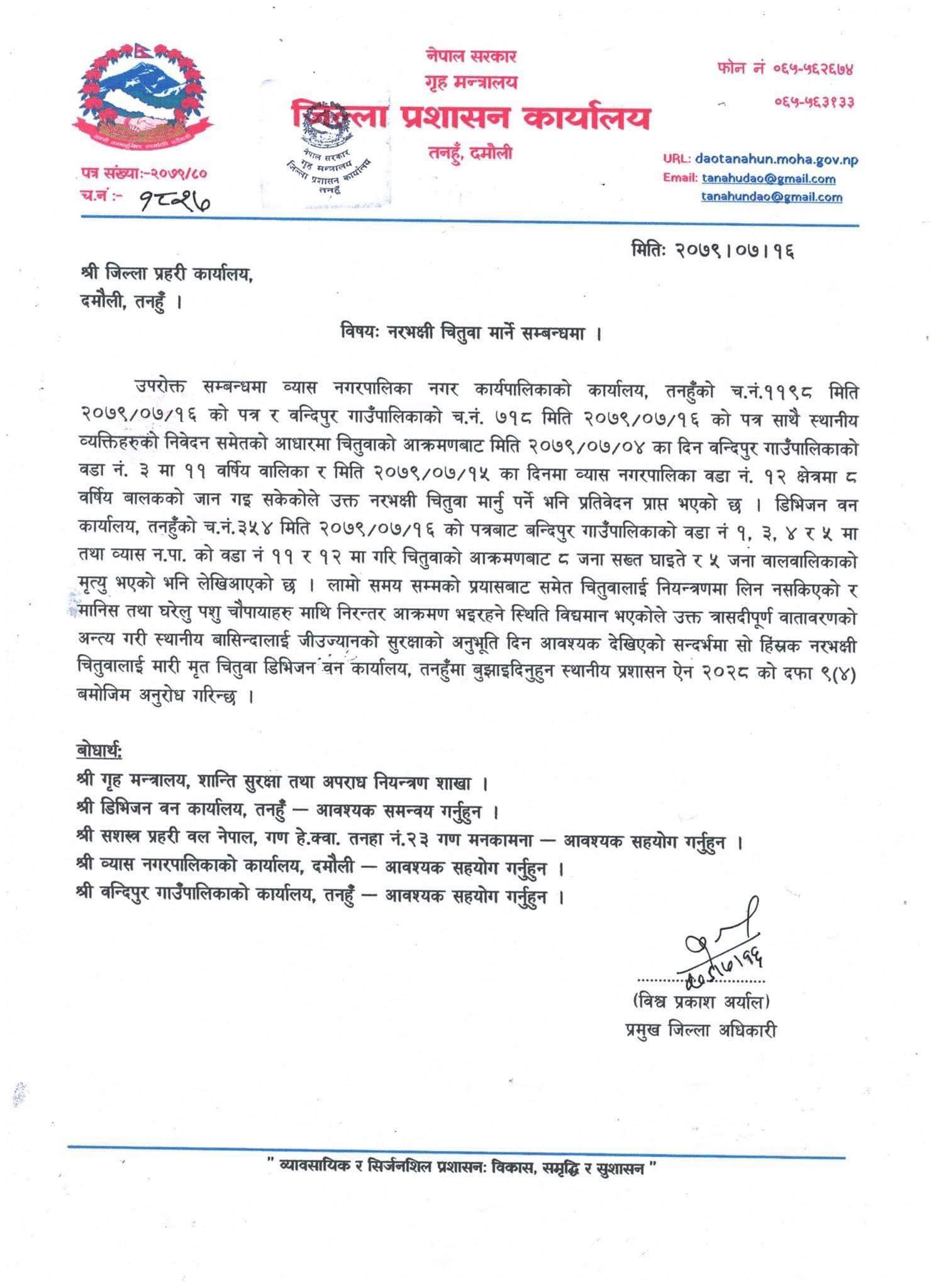 स्थानीय प्रशासन ऐन २०२८ को दफा ९(४) बमोजिम नरभक्षी चितुवालाई मारेर डिभिजन वन कार्यालय तनहुँमा बुझाउन प्रहरीलाई अनुरोध गरिएको प्रमुख जिल्ला अधिकारी  विश्वप्रकाश अर्यालले बताए ।