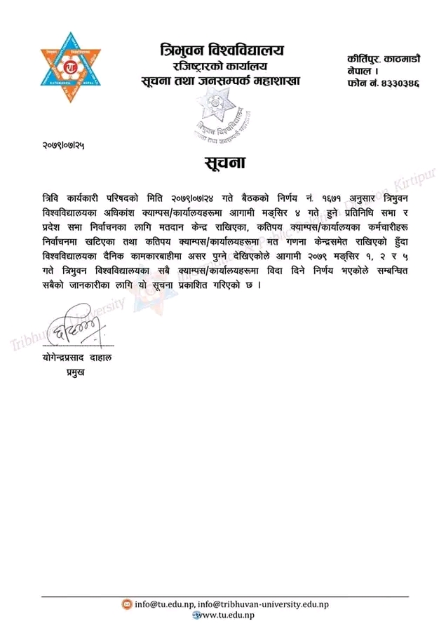 काठमाडौं : त्रिभुवन विश्वविद्यालयले मंसिर ४ गते हुने प्रदेश तथा प्रतिनिधि सभा सदस्यका लागि हुने निर्वाचनका कारण मंसिर १ देखि ५ गतेसम्म बिदा दिने भएको छ ।