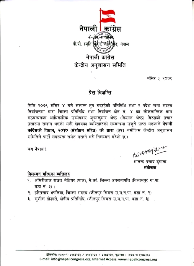 कांग्रेसका जिल्ला उपसभापति अमिरीलाल राउत भेडियर, सदस्य हरिप्रसाद थपलिया र क्षेत्रीय प्रतिनिधि सुशील ढोडारीलाई निलम्बन गरेको हो।