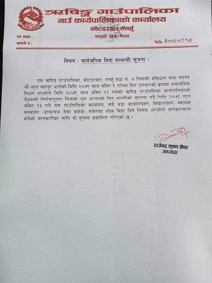 ऋषिङ : नेपाली कांग्रेसका महासमिति सदस्य एवं संविधानसभा सदस्य झुलबहादुर आलेको निधनमा तनहुँको ऋषिङ गाउँपालिकाले भोलि शोक बिदा दिने भएको छ । गाउँपालिकाका अध्यक्ष राजेन्द्रकृष्ण श्रेष्ठले आलेका निधनमा गाउँपालिकाले भोलि शोक बिदा दिएको बताए ।