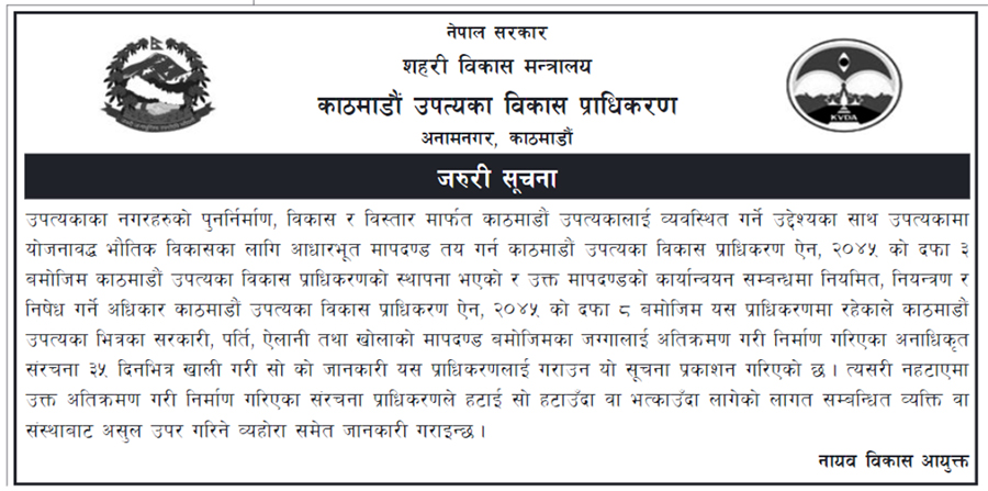 काठमाडौं  : काठमाडौं उपत्यका विकास प्राधिकरणले सरकारी र ऐलानी जग्गा अतिक्रमण गरेर बनाइएका सबै संरचना ३५ दिनभित्र हटाउन भनेको छ ।