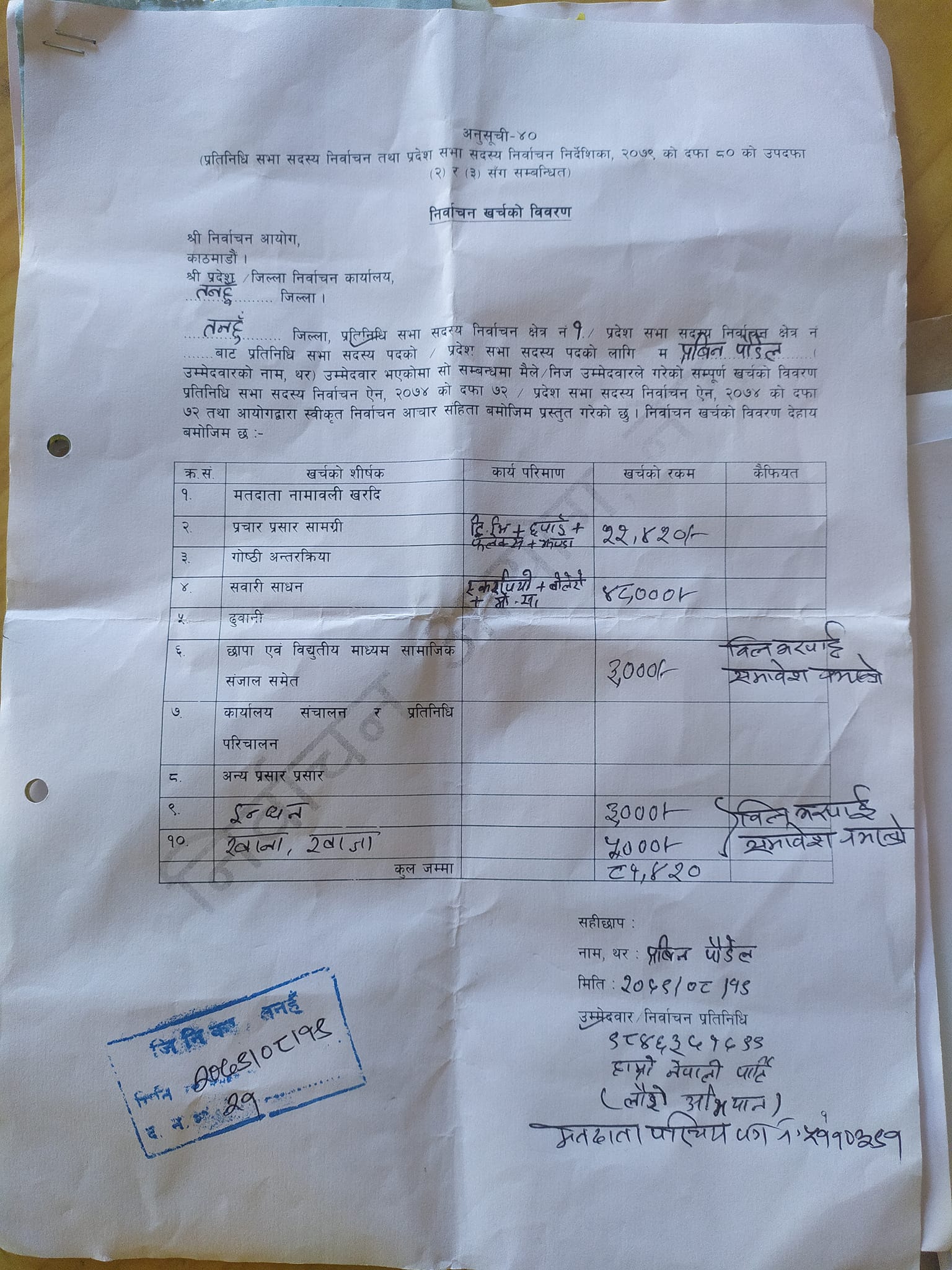 उनका अनुसार सवारीसाधन ४८ हजार , प्रचार प्रसार सामग्रीमा २२ हजार ४ सय २० ,छापा एवं विद्युतीय सामग्रीमा ३ हजार ,इन्धनमा ३ हजार , खाना र खाजा ५ हजार खर्च भएको जनाएको छ ।