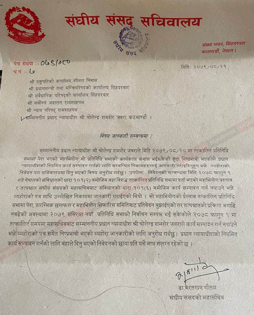 गत फागुन १ गते तत्कालीन प्रतिनिधिसभामा महाअभियोग प्रस्ताव दर्ता गरिएकोमा सो महाभियोगको प्रस्ताव तत्कालीन प्रतिनिधिसभामा पेश, प्रारम्भिक छलफल र महाभियोग सिफारिस समितिबाट प्रतिवेदन बुझाईएको तर तत्पश्चातको प्रक्रिया अगाडि नबढेको अवस्थामा नयाँ निर्वाचन सम्पन्न भएकाले जबराले कार्य सम्पादन गर्न नपाउने भन्ने व्यहोराको पत्र समेत निष्प्रभावी भएको संसद सचिवालयको पत्रमा उल्लेख छ ।