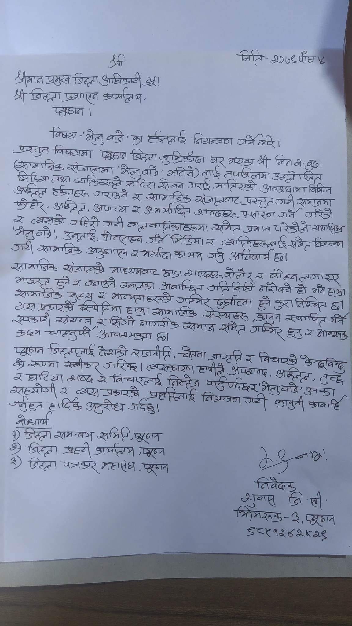 उनका हर्कतलाई नियन्त्रण गर्न माग गर्दै प्रमुख जिल्ला अधिकारीलाई बुझाइएको ज्ञापन पत्रमा ‘त्यसको गहिरो गरी बालबालिकाहरुमा समेत प्रभाव परेकोले यथाशीघ्र ‘भेलु बाजे’ र उनलाई प्रोत्साहन गर्ने युट्युबर र व्यक्तिहरुलाई नियन्त्रण गरी सामाजिक अनुशासन र मर्यादा कायम गर्न प्यूठानका सचेत युवाहरुले माग गरेका छन् ।