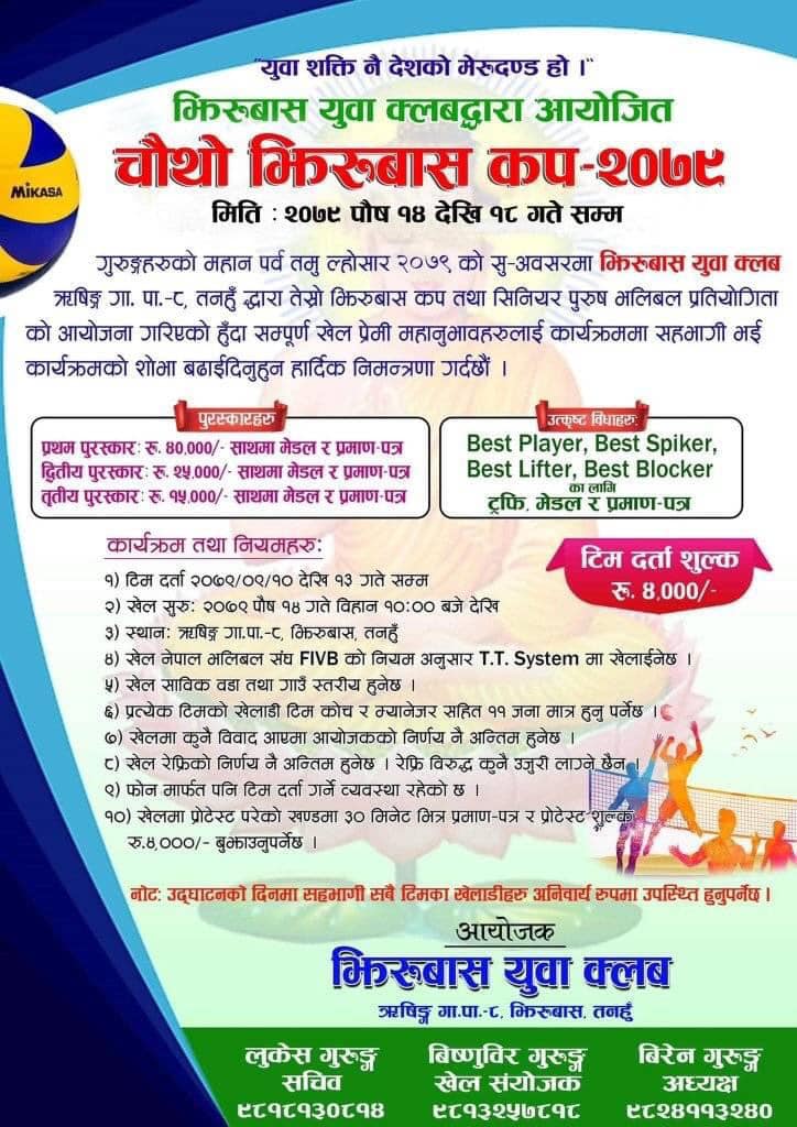 ‘युवा शक्ति नै देशको मेरुदण्ड होl’ भन्ने मुला नारा साथ झिरुबास युवा क्लब गुरुङहरुको महान चाड पर्व ‘तमु ल्होसार’को अवसर परेर कपको आयोजना गरेको क्लबका अध्यक्ष बिरेन गुरुङले जानकारी दिए ।