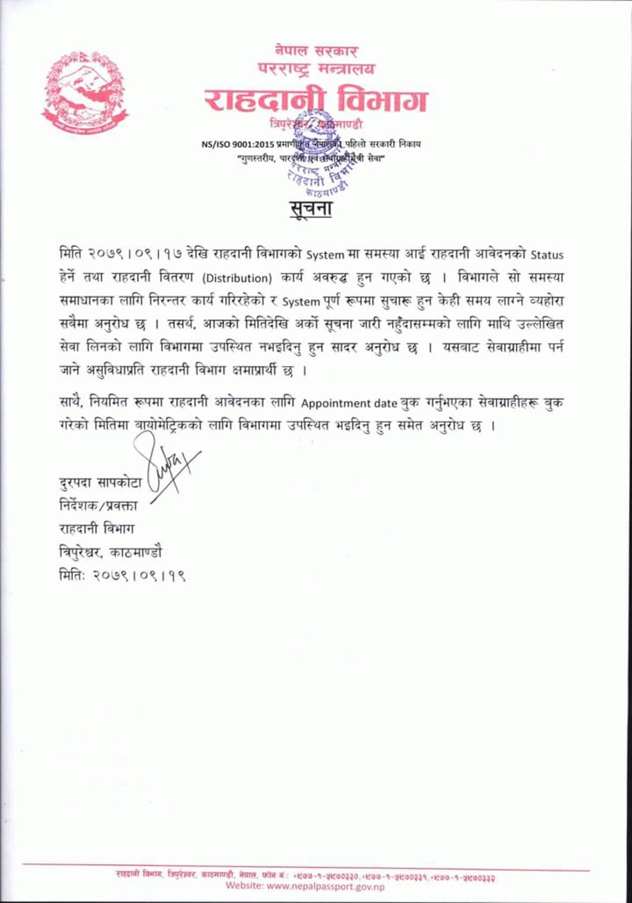 सापकोटाले एक सूचना जारी गर्दै मंगलबारदेखि अर्को सूचना जारी नहुँदासम्मको लागि राहदानी वितरण नहुने जानकारी दिएकी छन्। अर्को सूचना जारी नहुँदा सम्मलाई विभागमा उपस्थित नभइदिन सेवाग्राहीलाई आग्रह गरिएको छ।