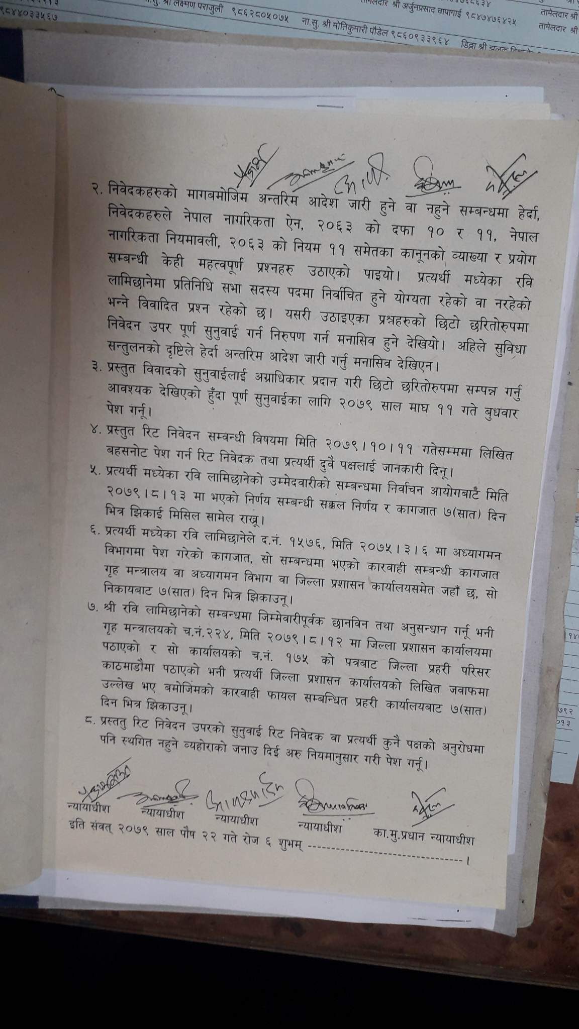 आदेशमा भनिएको छ, ‘प्रत्यथीमध्येका रवि लामिछानेमा प्रतिनिधि सभा सदस्य पदमा निर्वाचित हुने योग्यता रहेको वा नरहेको भन्ने विवादित प्रश्न रहेको छ । यसरी उठाइएको प्रश्नको छिटो छरितोरुपमा निवेदन उपर पूर्ण सुनुवाई गर्न निरुपण गर्न मनासिव हुने देखियो । अहिले सुविधा सन्तुलतको दृष्टिले हेर्दा अन्तरिम आदेश जारी गर्नु मनासिव देखिएन ।’