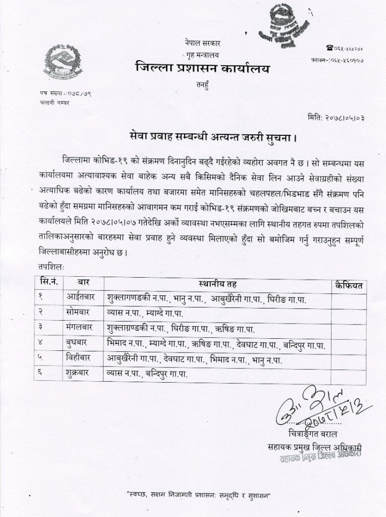 जिल्ला प्रशासन कार्यालय तनहुँले जिल्लाका स्थानीय तहलाई बार अनुसार सेवा दिने भएको छ ।कोभिड–१९को सङ्क्रमण दिनदिनै बढ्दै गइरहेको र कार्यालयमा सेवाग्राहीको चाप अत्याधिक बढेपछि जिल्ला प्रशासन कार्यालयले सेवा प्रदान गर्ने समय विभाजन गरेको हो ।भदौ ७ गतेबाट अर्को व्यवस्था नहुदाँसम्मको लागि स्थानीय तहगत रुपमा फरक फरक दिनमा सेवा प्रदान गर्न प्रशासनले समय तालिका सार्वजनिक गरेको छ ।