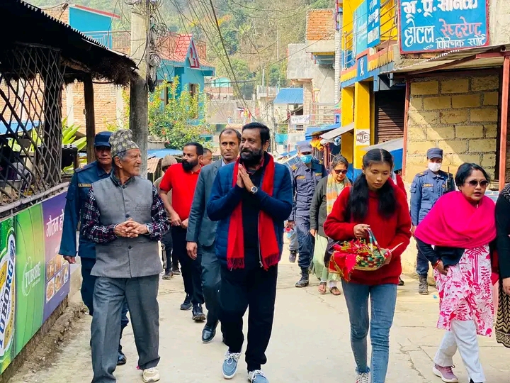 छाब्दी विकास कोषका अध्यक्ष हेम रानाभाट र उपाध्यक्ष दुर्गा मगर सहित स्थानियले नेता निधिलाई भादगाउले टोपी र खादा लगाएर स्वागत गरेका थिए।