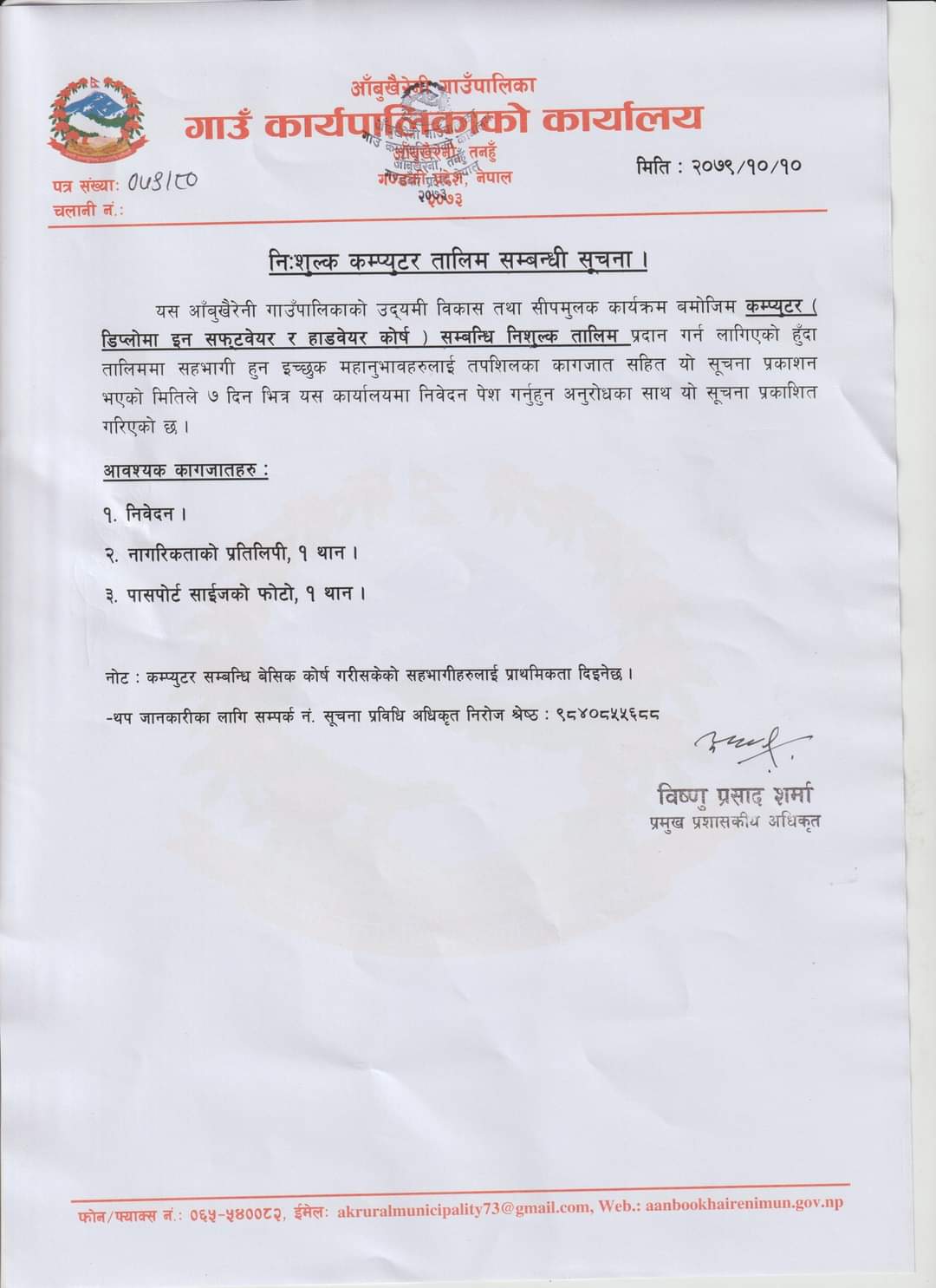 सूचनानुसार कम्प्युटर तालिम अन्तर्गत कम्प्युटर डिप्लोमा इन सफ्टवेयर र हाडवेयर कोर्ष निशुल्क प्रदान गर्न लागिएको जनाएको छ । तालिम सहभागी हुनका लागि वेसिका कोर्ष अनिवार्य गर्नु पर्ने प्रशासकीय अधिकृत विष्णु प्रसाद शर्माले जानकारी दिए ।