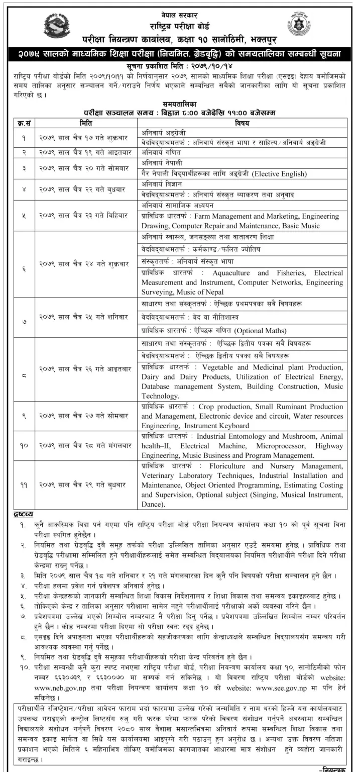 बोर्डको निर्णय अनुसार एसईई चैत १७ गते देखि चैत २९ गतेसम्म हुने भएको छ। परीक्षा बिहान ८ बजेदेखि ११ बजेसम्म हुनेछ।