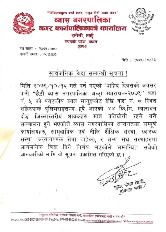 नगरपालिकाले भोलि व्यास -५ मानुङ्गकोट देखि व्यास -८ स्थित शहीद पार्क पुलीमराङ सम्म ४४ किमी जिल्ला स्तरीय म्याराथन दौड गर्दैछ ।