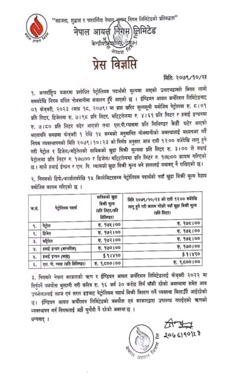 निगमले भारतबाट पेट्रोलियम पदार्थको मूल्य बढेर आएको र निगमलाई घाटा रहेकाले पेट्रोल र डिजेलमा प्रतिलिटर ३/३ रुपैयाँका दरले मूल्य वृद्धि गरिएको निगमले विज्ञप्तिमार्फत जानकारी दिएको छ ।