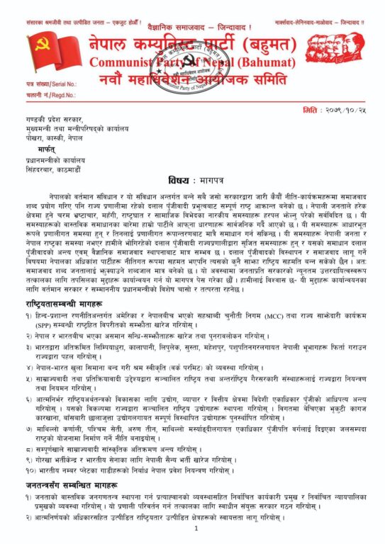 नेकपा बहुमत तनहुँले आइतबार प्रमुख जिल्ला अधिकारी छविलाल रिजात मार्फत् सरकारलाई राष्ट्रिय माग र बुँदे राष्ट्रिय मुद्दा सहित ४४ बुँदे  माग पत्र बुझाएको हो।