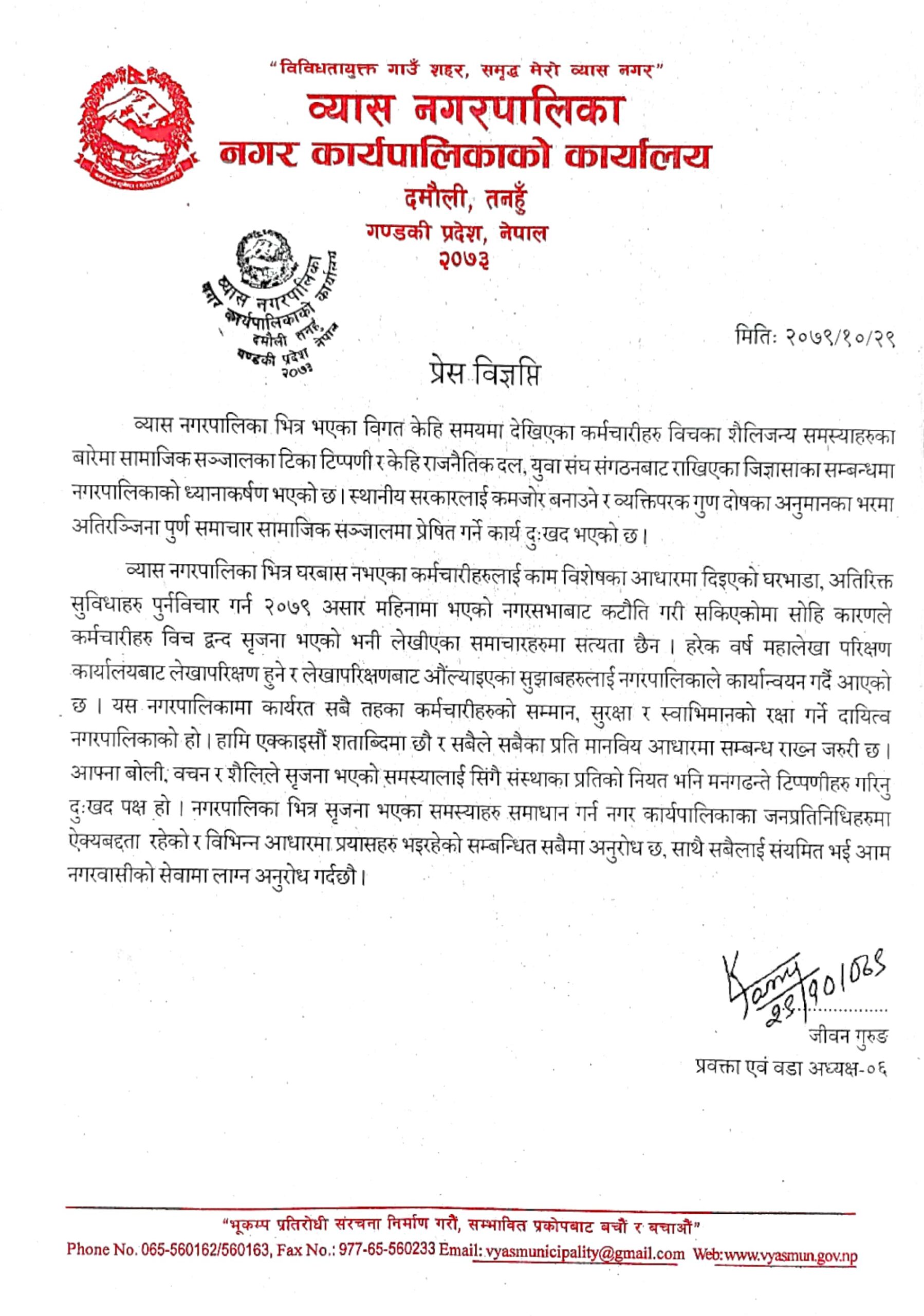 प्रवक्ता जीवन गुरुङद्वारा जारी गरेको विज्ञप्तिमा ” व्यास नगरपालिका भित्र घरबास नभएका कर्मचारीहरुलाई काम विशेषका आधारमा दिइएको घरभाडा, अतिरिक्त सुविधाहरु पुर्नविचार गर्न २०७९ असार महिनामा भएको नगरसभाबाट कटौति गरी सकिएकोमा सोहि कारणले कर्मचारीहरु विच द्वन्द सृजना भएको भनी लेखीएका समाचारहरुमा सत्यता छैन । ”