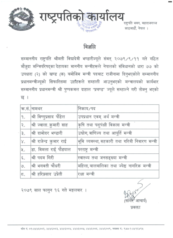 राष्ट्रपति कार्यालयले मंगलबार एक विज्ञप्ति जारी गर्दै अब उक्त मन्त्रालयहरुको जिम्मेवारी प्रधानमन्त्रीलाई दिइएको उल्लेख गरेको छ। यसअघि नै प्रधानमन्त्रीको जिम्मेवारीमा ८ वटा मन्त्रालय रहेका छन्। रास्वपा र राप्रपाका मन्त्रीहरुले सरकार छाडेपछि उक्त मन्त्रालयहरु रिक्त भएका थिए।
