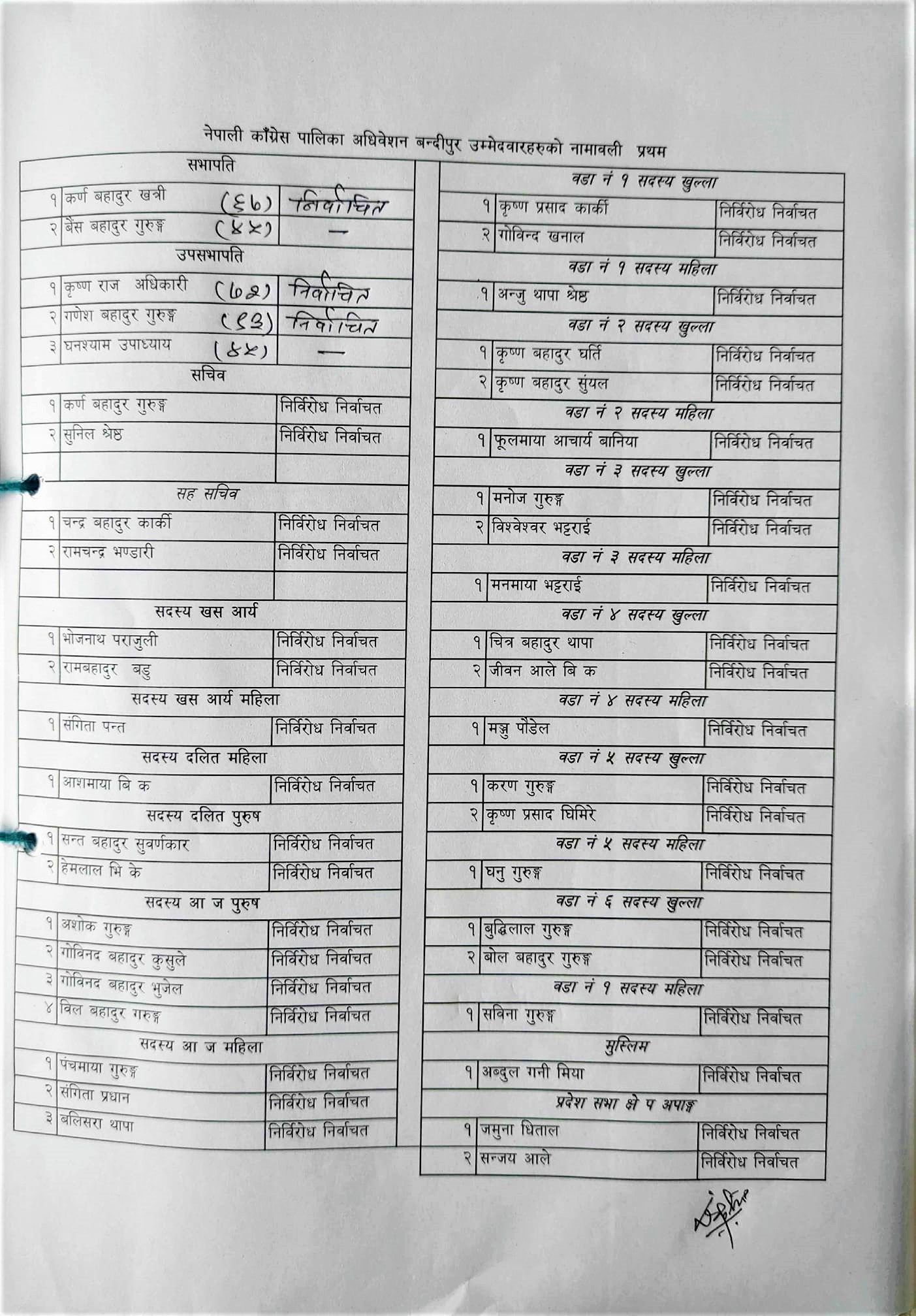 बन्दीपुरमा कांग्रेस अधिवेशन सम्पन :सभापतिमा खत्री निर्वाचित (सूची सहित)