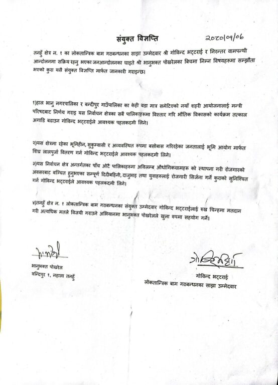यस्तै यश निर्वाचन क्षेत्र अन्तर्गत पर्ने पाँच वटै पालीकाहरूमा अविलम्ब अाैधाेगिक ग्रामकाे स्थापना गरि राेजगारकाे अवसरबाट बञ्चित युवाहरू लाई राेजगारि सिर्जना गर्ने कुरामा पहल गर्ने संयुक्त बिज्ञप्तिमा उल्लेख छ । बिज्ञप्तिमा यी बुँदा पूरा गर्नेतर्फ उम्मेदवार भट्टराईले पहल गरेबापत खुल्ला रूपमा रूखमा मत माग्न पाेख्रेल लाग्ने सहमति भएको उल्लेख छ ।