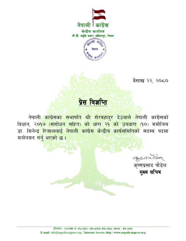 पार्टी सभापति शेरबहादुर देउवाले विधान, २०१७ (संशोधनसहित) को धारा २१ को उपधारा (१०) बमोजिम केन्द्रीय सदस्यमा मनोनीत गरेका हुन् ।