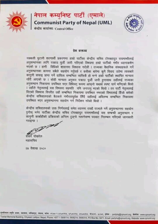 राज्यले गर्ने अनुसन्धानमा सहयोग पुगोस् भनेर अनुसन्धान र कानुनी कारबाही प्रक्रिया अन्तिम टुंगो नलागेसम्म रायमाझीलाई निलम्बन गरिएको एमाले महासचिव शंकर पोखरेलले विज्ञप्तिमार्फत् जानकारी दिएका छन् ।