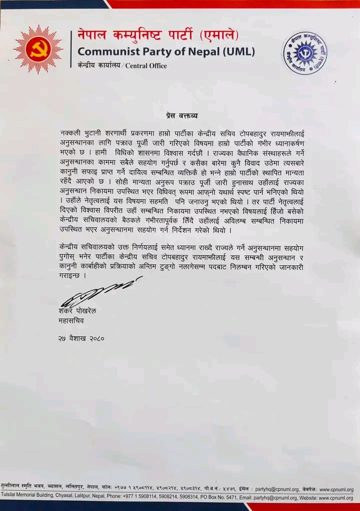 काठमाडौं : नेकपा एमालेले सचिव टोपबहादुर रायमाझीलाई निलम्बन गरेको छ ।