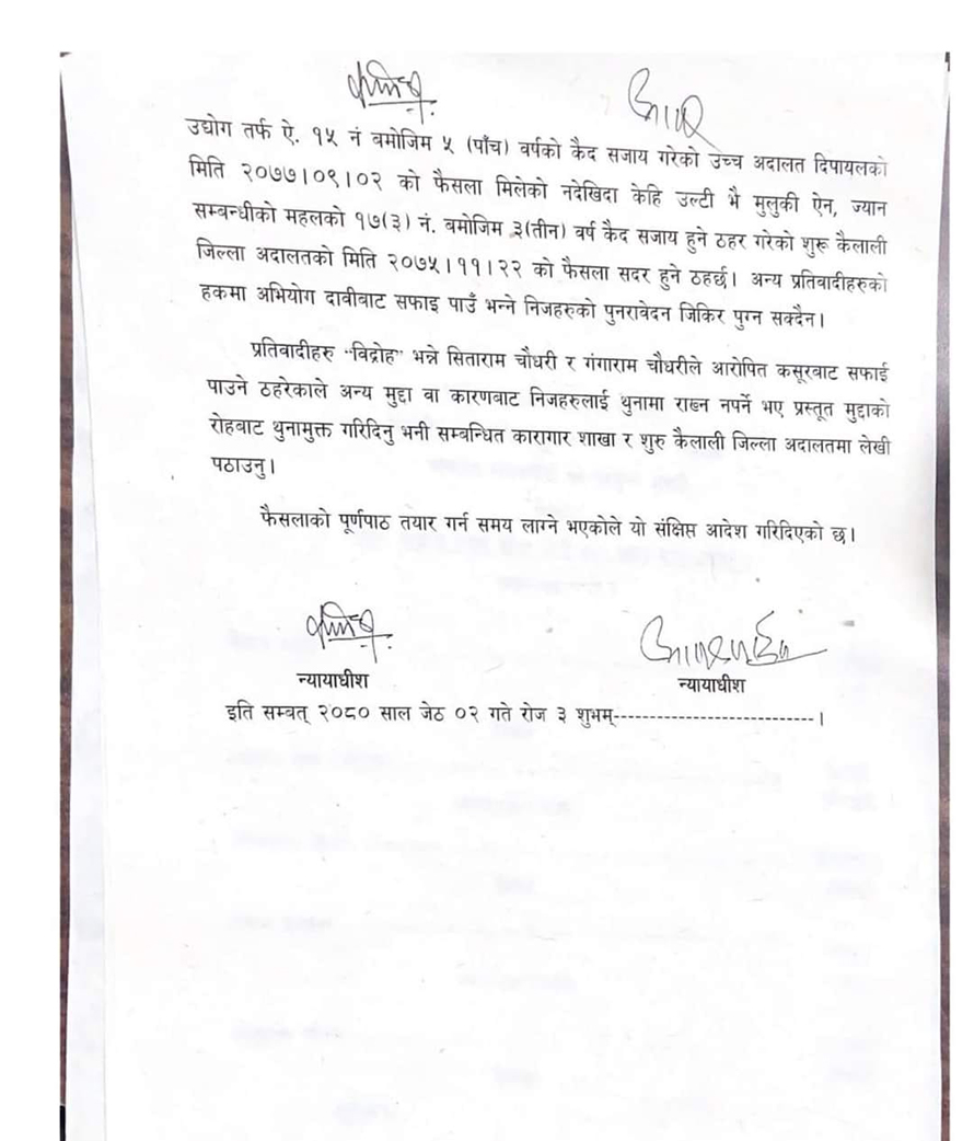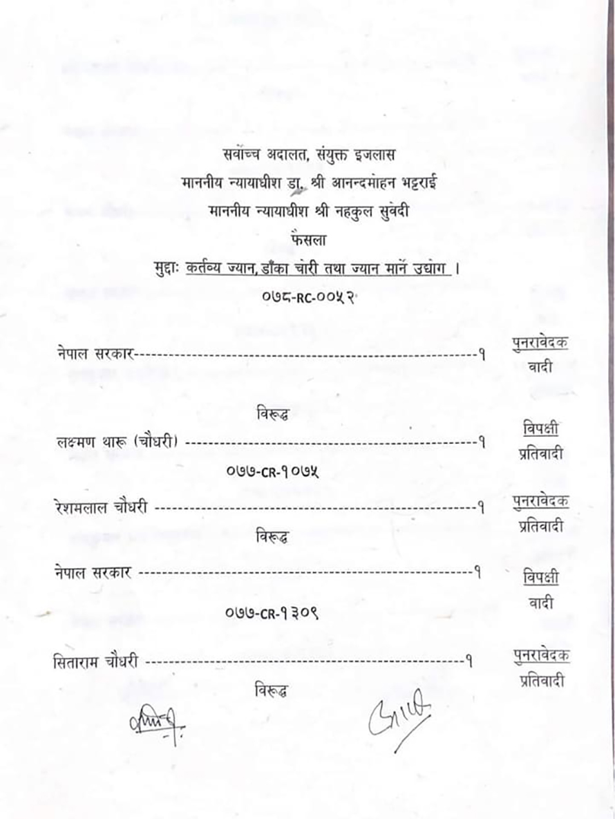 सर्वोच्चले यही घटनामा सीताराम चौधरी र गंगाराम चौधरीलाई भने सफाइ दिएको छ । उच्च अदालत दिपायलले उनीहरुलाई जन्मकैद र ज्यान मार्ने उद्योगको आरोपमा ५/५ वर्ष कैद सजाय हुने फैसला गरेको थियो ।
