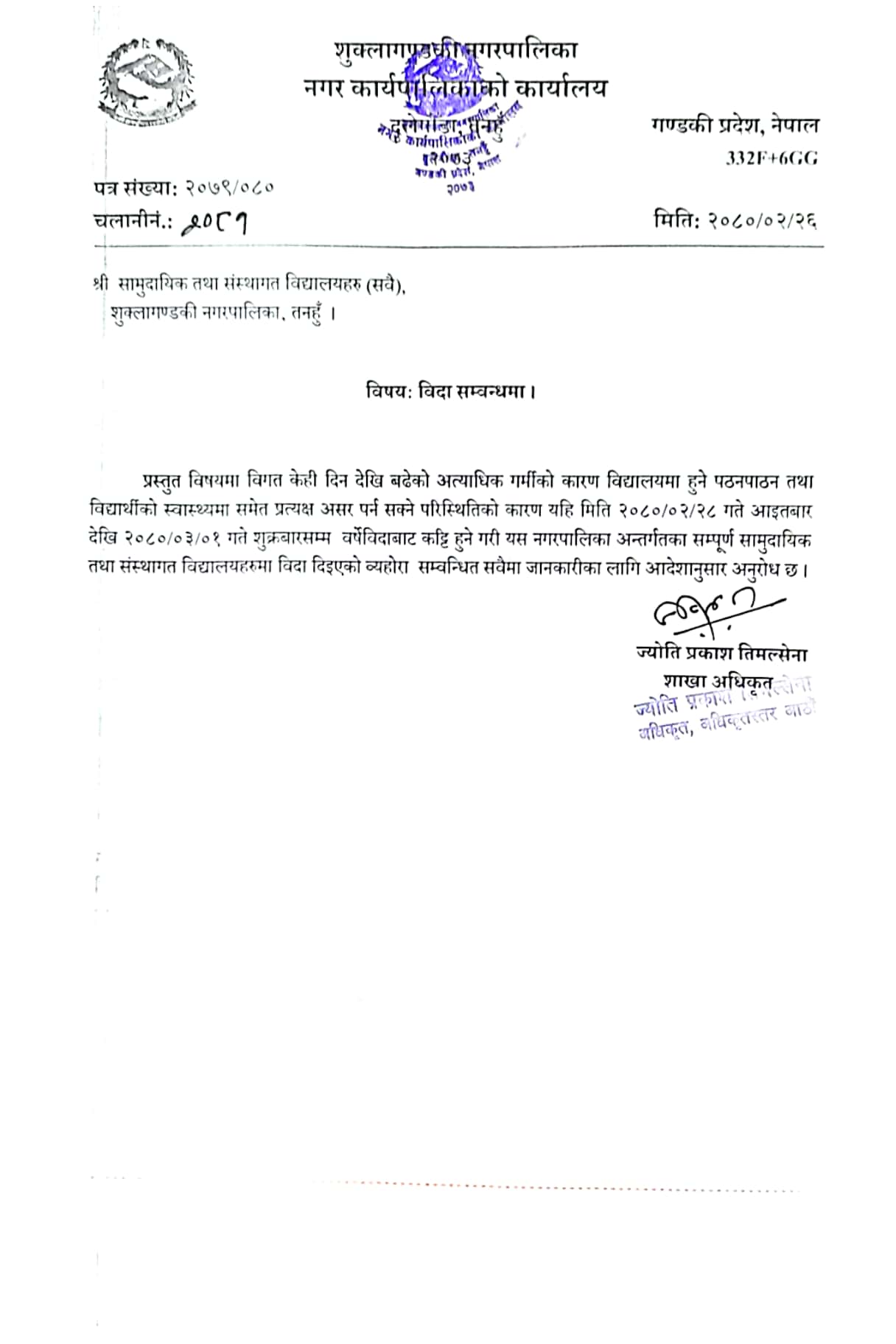 अत्याधिक बढेको गर्मीले पठनपाठन प्रभावित र विद्यार्थीको स्वास्थ्यमा समस्या देखिएकाले विद्यालय बन्द गराउने निर्णय गरेको शिक्षा अधिकृत ज्योतिप्रकाश तिम्लसेनाले जानकारी दिए ।
