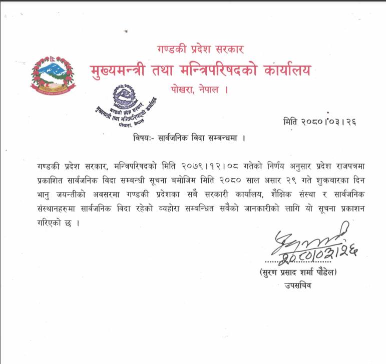 गण्डकी प्रदेश मुख्यमन्त्री तथा मन्त्रिपरिषद्को कार्यालयले मंगलबार एक सूचना जारी गरी भानु जयन्तीमा सार्वजनिक बिदा दिने निर्णय गरेको हो ।