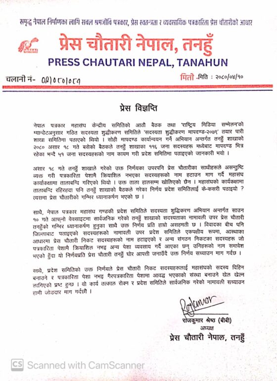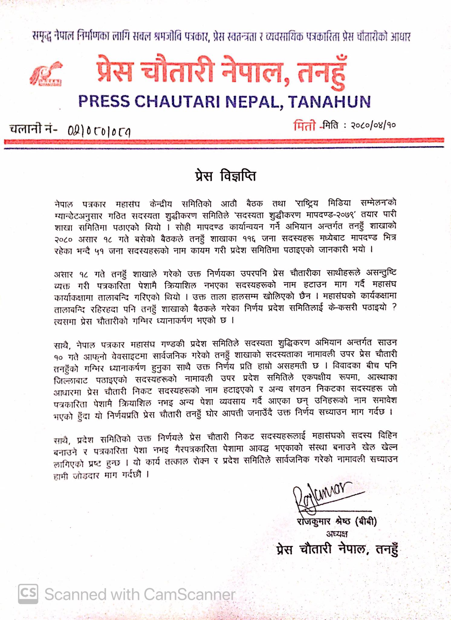 शुद्धीकरणको नाम दिएर वहुमतको नाममा चौतारी निकट क्रियाशिल पत्रकारहरुलाई सदस्यता नविकरण नगरिएको भन्दै प्रेस चौतारी तनहुँ शाखाले असहमती भएको अध्यक्ष राजकुमार श्रेष्ठ (बीवी) बताए ।