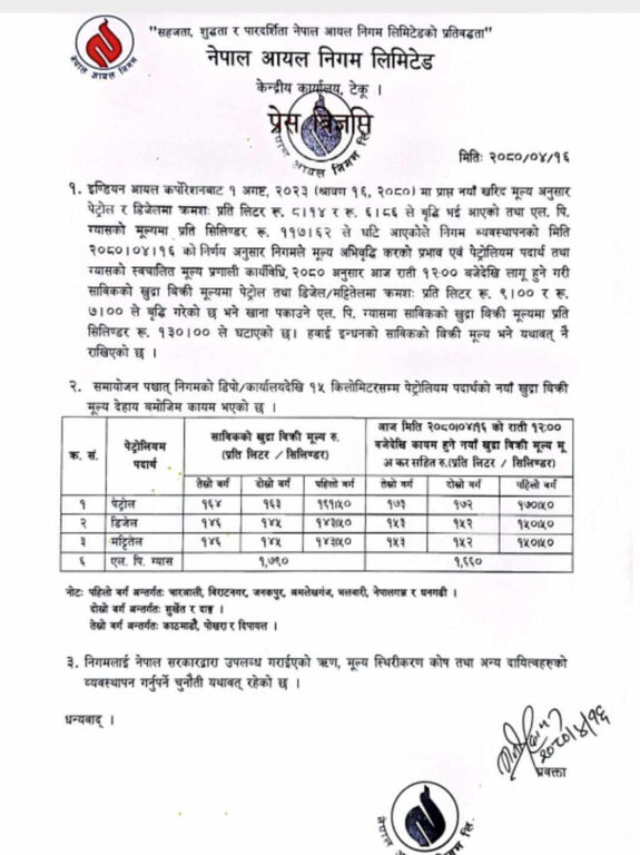 काठमाडौं : नेपाल आयल निगमले पेट्रोलियम पदार्थको मूल्य बढाएको छ ।